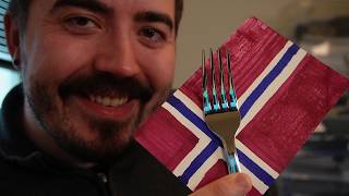 This is a Norwegian language learning video that teaches vocabulary related to eating and drinking. It covers common kitchen items including cutlery (fork, knife, and spoon), dishes (plate and bowl), and drinking vessels (glass and cup). The video explains when to use each item, such as using a knife and fork for solid food on a plate, but using a spoon for soup in a bowl because soup is runny and would fall through the holes of a fork. It's designed for beginners learning Norwegian vocabulary through visual demonstration and clear, simple explanations.